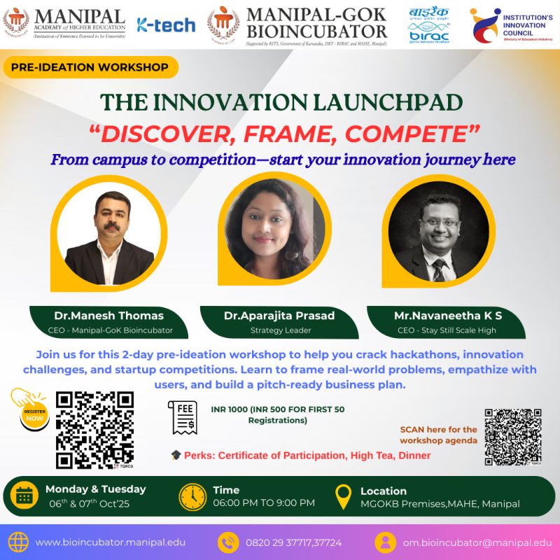 Dear Innovators & Students, Greetings from Manipal-GoK Bioincubator BioNEST & MGOKB E-Cell, We’re excited to invite you to The Innovation Launchpad: Discover, Frame, compete—a dynamic 2-day pre-ideation workshop designed to prepare you for hackathons, innovation challenges, and entrepreneurship competitions. Whether you're from engineering, life sciences, business, or design, this workshop will help you identify meaningful problems, empathize with users, and build a pitch-ready business plan. It’s the perfect starting point for anyone looking to turn curiosity into clarity—and ideas into impact. Dates: 06th & 07th October 2025 [Monday & Tuesday] Time: 6:00 PM – 9:00 PM Venue: Manipal-GoK Bioincubator Premises Expected Participants : Students, early-stage innovators, and aspiring founders across all domains Fees: INR 1000 (First 50 Registrations: INR 500)