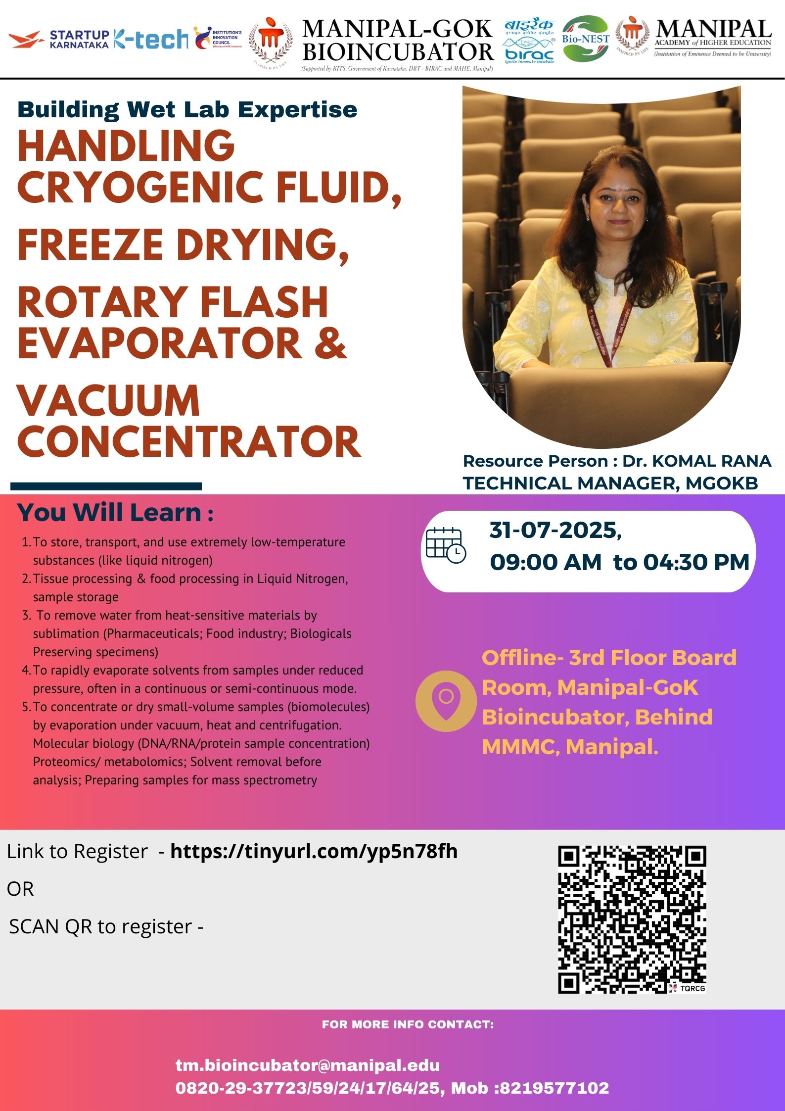 Manipal Government of Karnataka Bioincubator–BioNEST is pleased to announce an upcoming hands-on workshop: “Building Wet Lab Expertise: Handling Cryogenic Fluids, Freeze Drying, Rotary Flash Evaporator & Vacuum Concentrator”