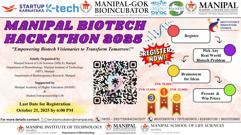 Manipal-GoK Bioincubator-BioNEST and its Student Entrepreneurship Cell, in association with Manipal School of Life Sciences (MSLS), Department of Biotechnology, Manipal Institute of Technology, Manipal, and Department of Biotherapeutics Research, MAHE, Manipal, are organising a virtual Manipal BioTech Hackathon 2025. Manipal BioTech Hackathon is focused on identifying and solving critical problems from the Biotechnology domain. This Hackathon is conducted with the vision of promoting student innovations, startup creation, and encouraging critical thinking skills essential to addressing the most pressing issues in the Biotechnology domain. Theme: BIOTECHNOLOGY The details of the event are Who can Apply: All the enrolled students and researchers also pursuing UG / PG/ Doctoral Studies in any Academic or Research Institution. Max. team size: 5 Min. team size: 2 Mentor: Minimum 1 (Optional) Registration fee: INR 1000/- per team Last Date for Registration: October 21 (Tuesday), 2025, 6.00 p.m. Euphoria 12.0 (Formal Inauguration of BioTech Hackathon 2025): October 23, 2025, 9.30 a.m. Final Pitch Presentation: November 6, 2025 Please note: Kindly check all information before submitting the form. Please provide valid contact details. Registration Link: https://lnkd.in/gqSHFNBh Rules & Regulations: https://lnkd.in/gm-VzZ6i Team Lookout Form: https://lnkd.in/gxB8sJwn