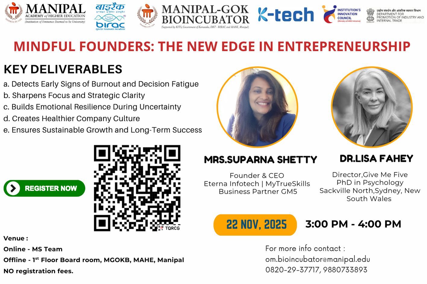 Manipal-GoK Bioincubator invites you to a transformative session on entrepreneurial wellbeing and leadership featuring: Dr Lisa FAHEY OAM– Renowned psychologist, Founder of Quovus Pty Ltd, CTARS, Provent & GM5 Mrs. Suparna Manipal – Founder & CEO, Eterna Infotech | My True Skills Business Partner, GM5 With over 30 years of global experience in trauma recovery and sustainable care models, our speakers bring powerful insights into building resilient ventures. Key Takeaways: 1. Spot burnout and decision fatigue early 2. Sharpen strategic clarity 3. Build emotional resilience 4. Foster healthier company culture 5. Ensure long-term, sustainable growth Date: Saturday, 22 Nov 2025 Time: 3:00 PM – 4:00 PM Venue: MS Teams & Manipal-GoK Bioincubator (1st Floor Board Room)