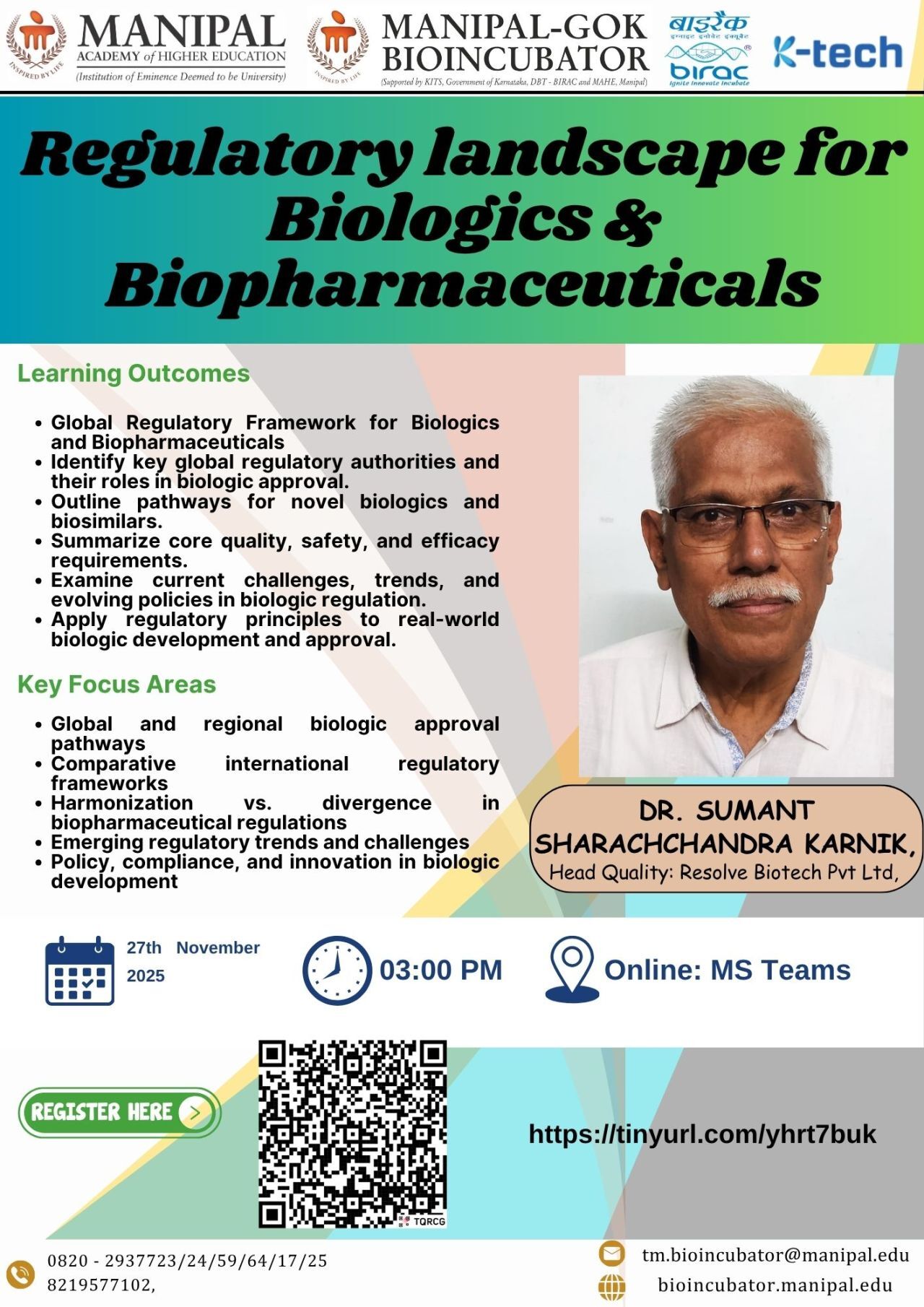 Manipal-GoK Bioincubator–BioNest is conducting a Session on “Regulatory Landscape for Biologics and Biopharmaceuticals.” The session aims to provide insights into the evolving regulatory frameworks that govern the development, approval, and commercialization of biologics and biopharmaceuticals. Participants will gain an understanding of key regulatory pathways, compliance requirements, and emerging trends shaping the biologics sector globally and in India. This talk is designed for researchers, startups, and industry professionals interested in navigating the complex regulatory environment and accelerating the successful translation of biotherapeutic innovations from lab to market. Join us to enhance your understanding of the regulatory ecosystem and connect with experts in the Biopharma domain. Date: 27-11-2025, Thursday Time: 03.00 PM - 04:30 PM Speaker: Dr. SUMANT SHARACHCHANDRA KARNIK, Head Quality: Resolve Biotech Pvt Ltd, Mumbai, Maharashtra Platform: Online: Microsoft Teams & Offline: 1st floor board room, Manipal-GoK Bioincubator, Manipal Registration Link: https://lnkd.in/dMCRN54q