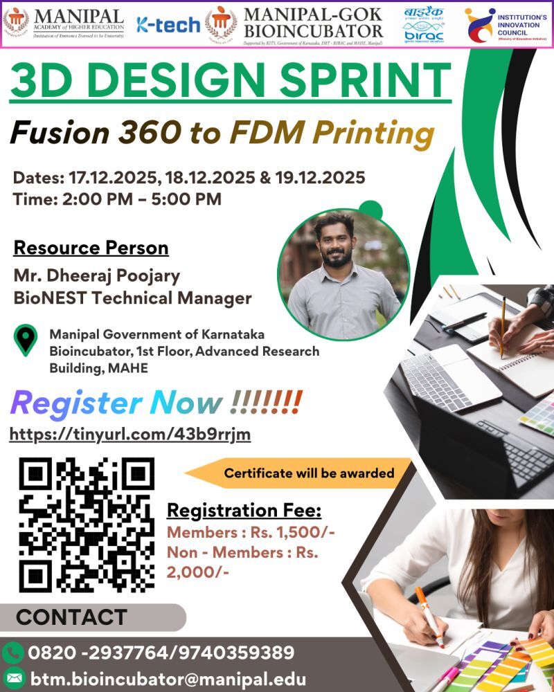 Manipal-GoK Bioincubator –BioNEST is organizing the “3D Design Sprint: Fusion 360 to FDM Printing” workshop, a comprehensive hands-on program designed to guide participants through the complete digital fabrication journey—from designing in CAD to producing a functional 3D-printed model. This immersive three-day training introduces learners to the fundamentals of Fusion 360, enabling them to develop precise sketches, apply constraints and dimensions, and build robust 3D models using essential and intermediate design features. As the workshop progresses, participants will transition from digital modelling to physical realization through an in-depth exploration of FDM (Fused Deposition Modelling) 3D printing. The highlight of the program is a Design-to-Print Challenge, where attendees will apply their newly acquired skills to create, slice, and print a model of their own, with the best performer being recognized during the award ceremony. Designed for students, researchers, innovators, and aspiring product developers, this workshop focuses on building practical competency, creative thinking, and confidence in converting ideas into real-world prototypes. Workshop Details Dates: 17.12.2025, 18.12.2025, and 19.12.2025 Time: 2 :00 PM – 5:00 PM Venue: (On-site) Manipal Government of Karnataka Bioincubator - BioNEST, 1st Floor, Advanced Research Building, MAHE Resource Person: Mr. Dheeraj Poojary,BioNEST Technical Manager,Manipal Government of Karnataka Bioincubator–BioNEST Seats per Batch: 25 Participants Registration Fee: MGOKB Members – ? 1,500/- , MGOKB Non-Members – ? 2,000/- Registration Deadline: 16.12.2025, 5:00 PM Registration Confirmation will be sent on 16.12.2025. Registration link: https://lnkd.in/dZhWEC4y Workshop Curriculum Day 1 – Fusion 360 Fundamentals Day 2 – Intermediate Modelling & Design for 3D Printing Day 3 – FDM Printing, Slicing & Design-to-Print Challenge What Participants Will Get 3 Days of Hands-On Training Fusion 360 Learning Materials (PDF) FDM 3D Printing Basics Guide Access to Fusion 360 Student License (Free) Individual Project Print (1 model per participant) Participation Certificate Competition Entry Winner certificate.