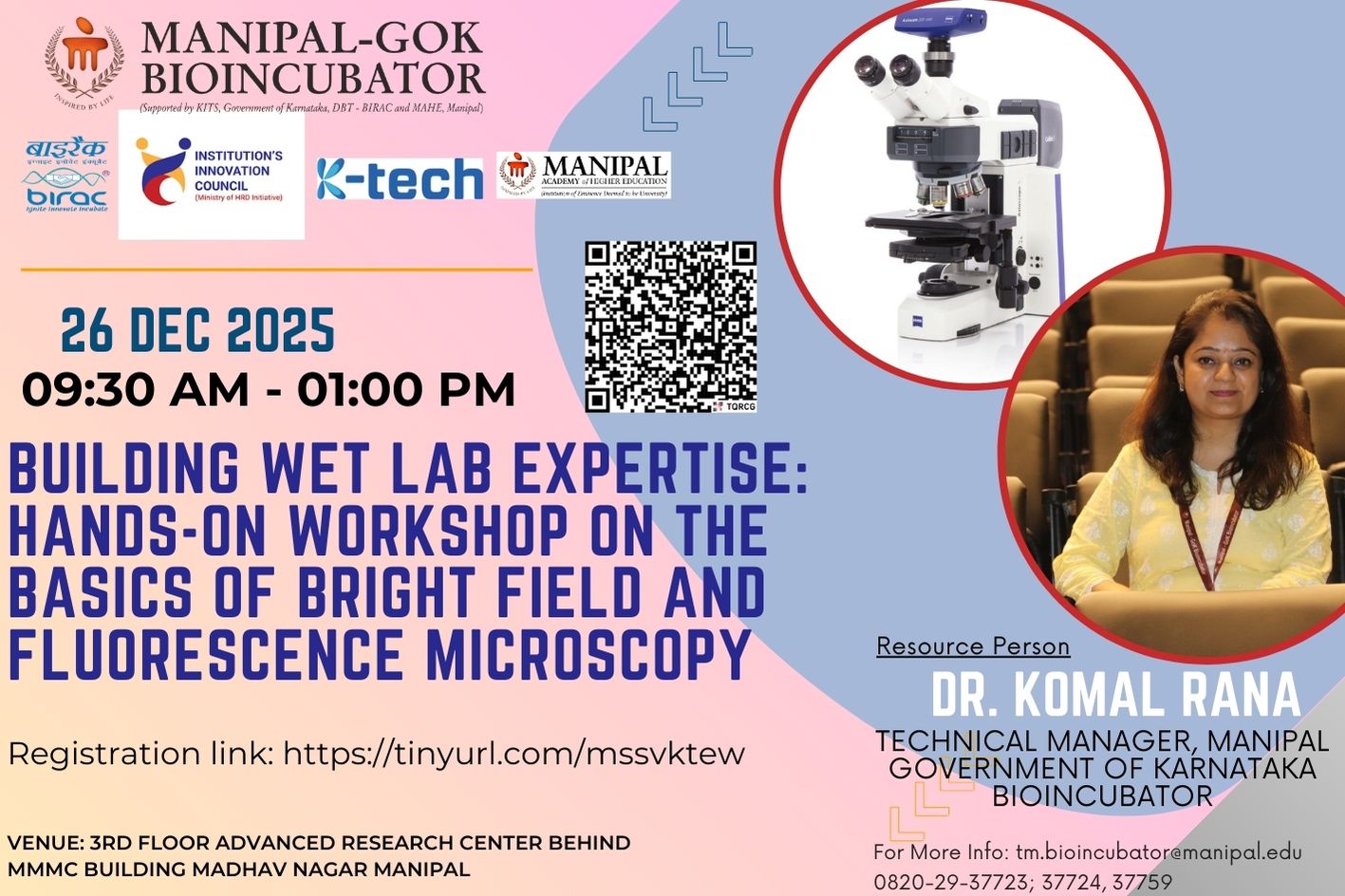 Manipal-GoK Bioincubator-BioNEST is conducting a “HANDS-ON WORKSHOP TO UNDERSTAND BASICS OF BRIGHT FIELD AND FLUORESCENCE MICROSCOPY”. This workshop will be very helpful to Students, Innovators, Researchers, Entrepreneurs, and anyone who would like to get an insight and hands-on exposure on the usage of bright field and fluorescence microscopy techniques to visualize the cells under microscope. INSTRUMENT: AXIOSCOPE 5 (Microscope- Upright); MAKE: CARL ZIESS Date & Day: 26-12-2025 (FRIDAY) Time: 09:30 AM – 01:00 PM Resource Personnel: Dr. Komal Rana: Technical Manager, Manipal-GoK-Bioincubator, MAHE, Manipal. Topics to be covered: Theory session Practical Hands-on session Venue: (On-site) Manipal Government of Karnataka Bioincubator, 3rd floor Advanced Research Centre Building (Behind MMMC), MAHE Seats per Batch: 20 Registration Link: https://lnkd.in/dtGEE69z Scan QR Code: Registration Fee: Members: INR 400/- Non-members: INR 700/- Registration will be open till: 25-12-2025, 02:00 PM * Confirmation Mail will be sent on 25-12-2025, 04:30 PM Certificates will be provided