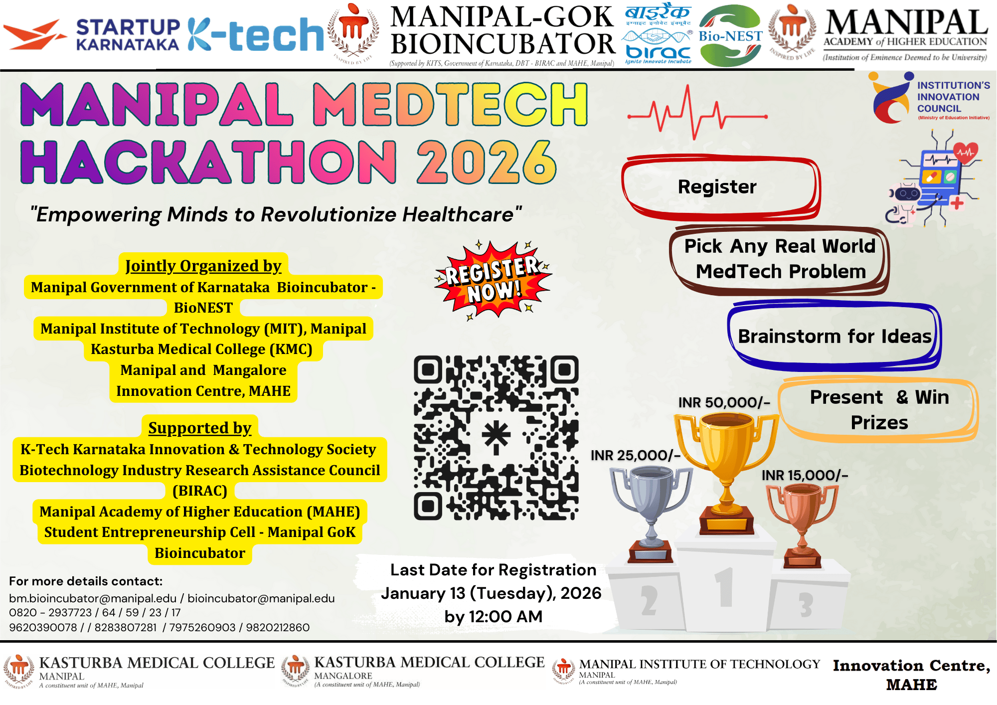 Manipal-GoK Bioincubator - BioNEST and its Student Entrepreneurship Cell, in association with Manipal Institute of Technology, Kasturba Medical College, Manipal (KMC) Manipal and Kasturba Medical College Mangalore and Innovation Centre MAHE, are organizing a virtual Manipal MedTech Hackathon 2026.  Manipal MedTech Hackathon is focused on identifying and solving critical problems in the healthcare/medical technology domain. This Hackathon is conducted with the vision to promote student innovations, start-up creation, and encourage critical thinking skills essential to address the most pressing issues in the MedTech domain.