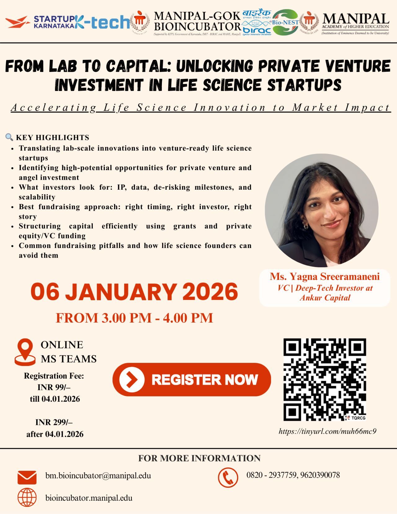Manipal-GoK Bioincubator- BioNest invites Life science and Deep-tech startups to join in for an expert session on navigating growth and venture fundraising pathways. This session will explore funding challenges, opportunities beyond government grants, and best practices to scale with venture investors.