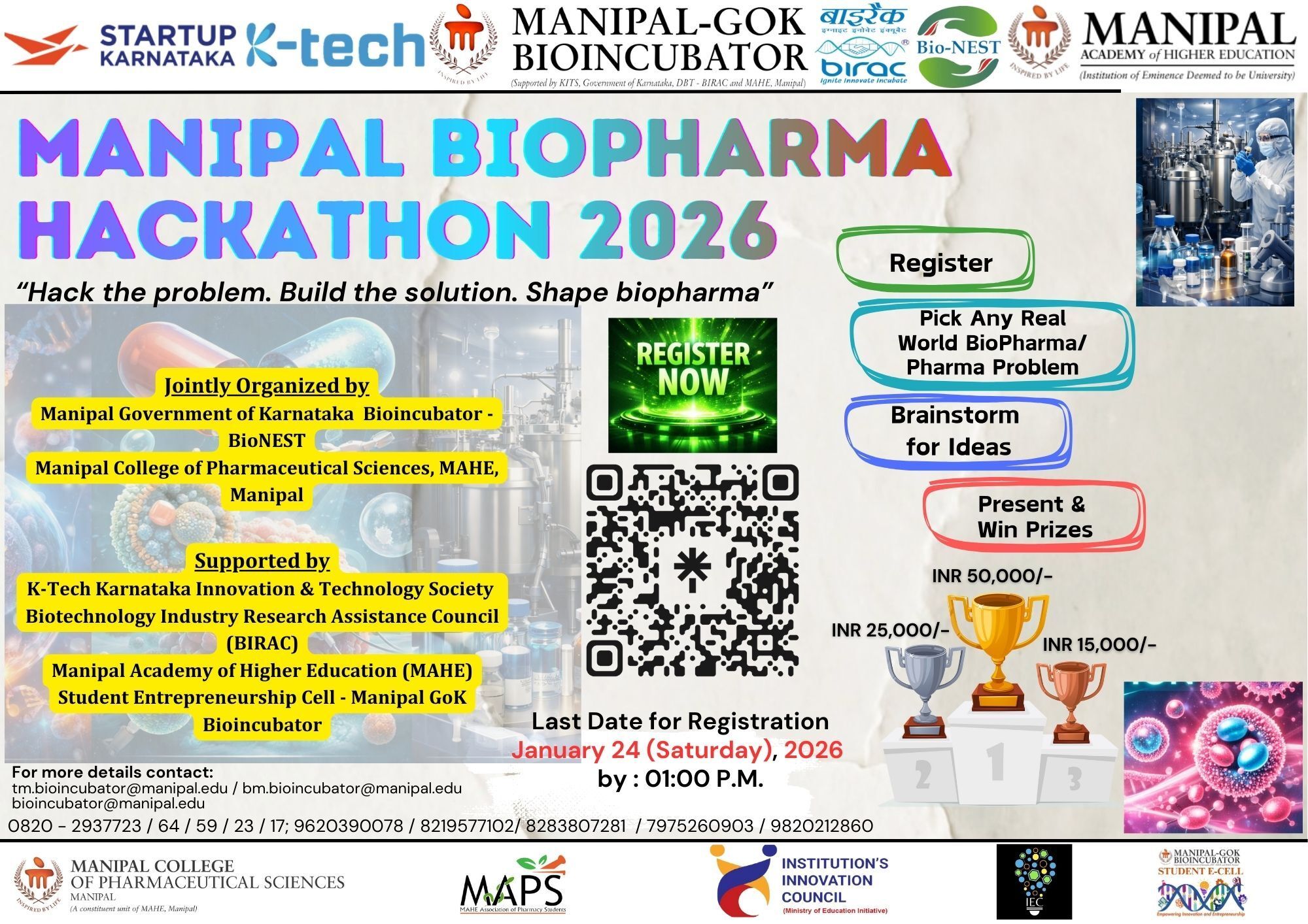 Manipal-GoK Bioincubator-BioNEST and its Student Entrepreneurship Cell (SEC-MGOKB), in association with Manipal College of Pharmaceutical Sciences (MCOPS), Manipal, are organising a virtual Manipal BioPharma Hackathon 2026. This contest is for all the enrolled students and researchers pursuing UG / PG/ Doctoral Studies in any Academic or Research Institution. BioPharma Hackathon is focused on identifying and solving critical problems from the BioPharma/Pharma domain.