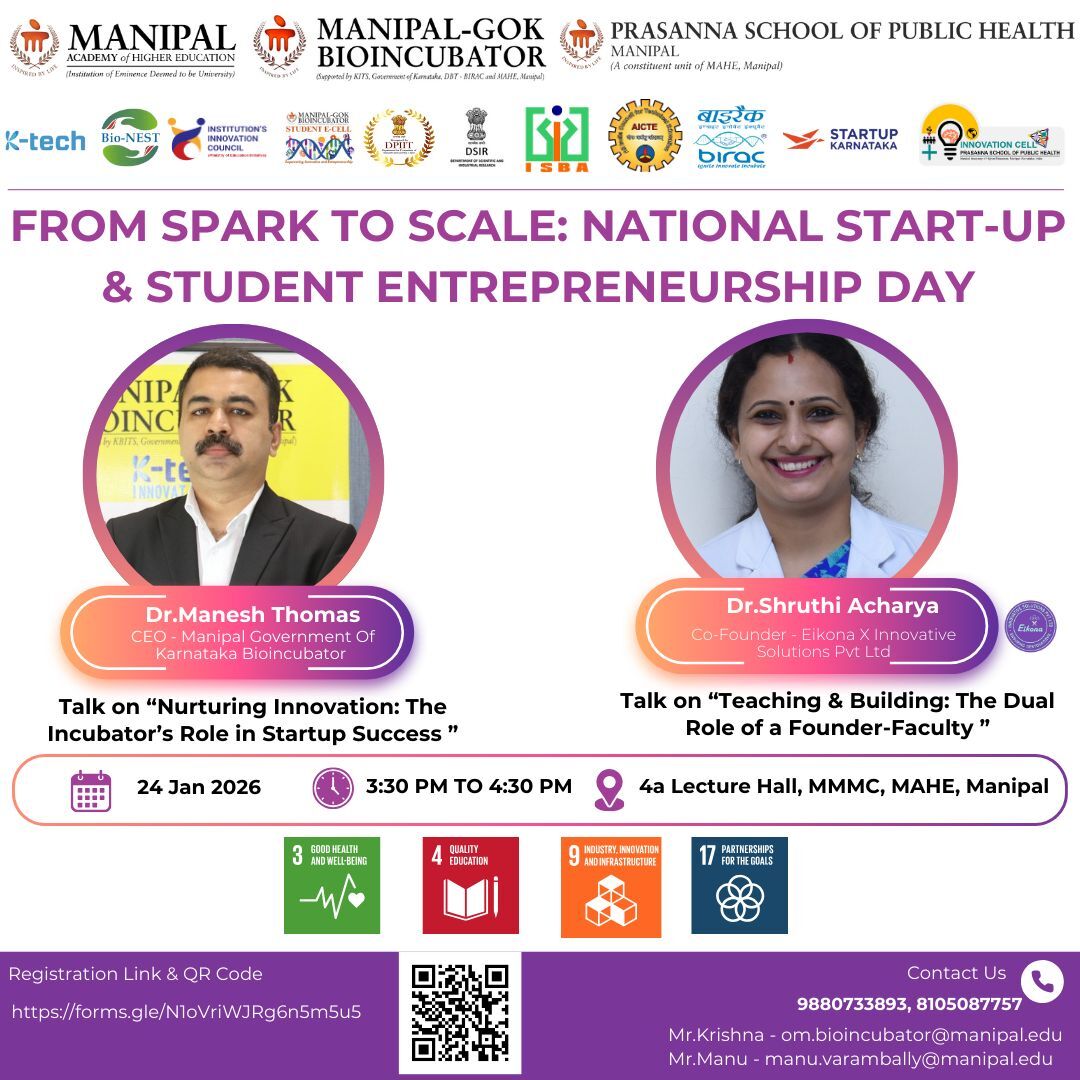 On behalf of National Start-Up Day & Student Entrepreneurship Day, to celebrate the spirit of innovation, resilience, and entrepreneurial courage that drives India’s start-up movement, Manipal-GoK Bioincubator-BioNest, in association with Prasanna School of Public Health (PSPH), MAHE, is conducting an event titled - "From Spark to Scale: National Start-Up & Student Entrepreneurship Day”
